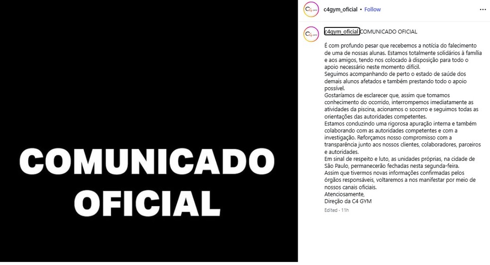A academia C4 Gym também disse que, “em sinal de respeito e luto, as unidades próprias, na cidade de São Paulo, permanecerão fechadas nesta segunda-feira (9)”.