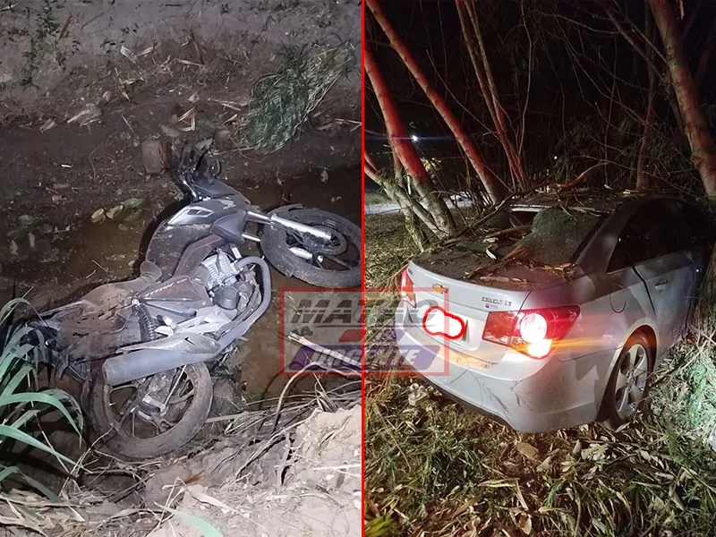 Um acidente deixou duas pessoas feridas, sendo um motociclista, gravemente, após a colisão entre um Chevrolet, modelo Cruze e uma moto, que teria sido arrastada por cerca de duas quadras e em seguida arremessados contra um córrego na Laert Mendes, em Matão.